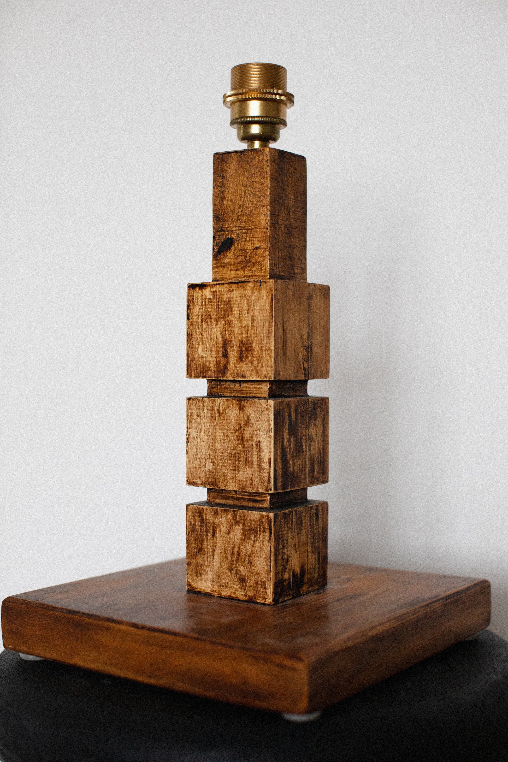 The lamp's base is a celebration of natural materials, expertly fashioned from rich, polished wood. The clean lines and geometric perfection of the cubic shape capture the essence of mid-century aesthetics, offering a timeless appeal that effortlessly complements various decor styles